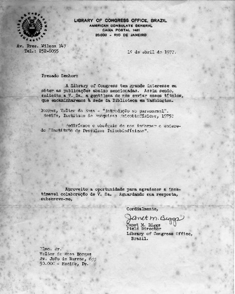 A repercussão do livro foi das melhores, tanto assim que, mediante ofício, datado de 1º de abril de 1977 e assinado por Janet M. Biggs, a Library of Congress Office, Brazil, solicitou-me o envio do Introdução ao Paranormal à sede da Biblioteca em Washington.